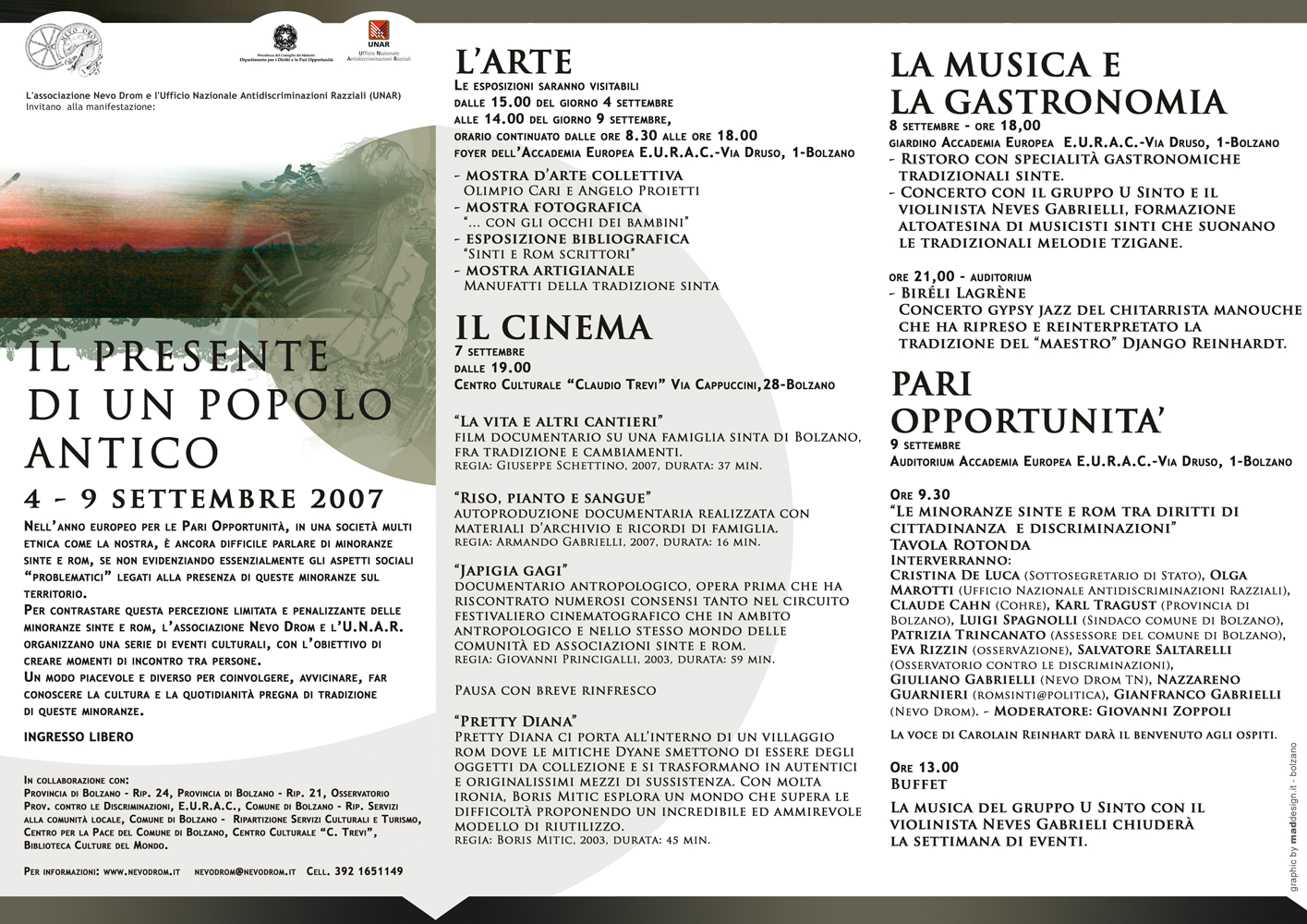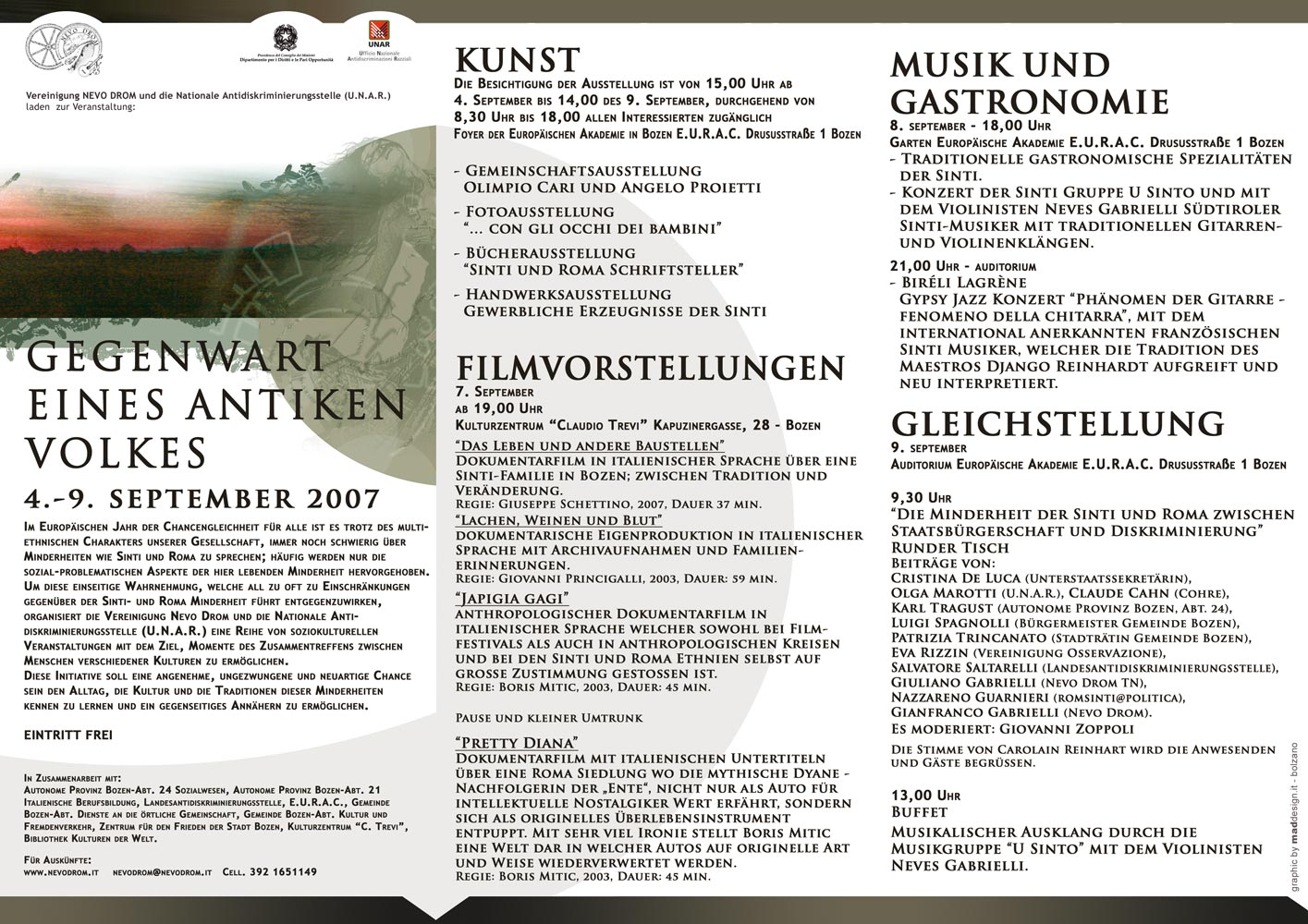 In occasione della giornata della memoria 2007, l’associazione Nevo Drom, in collaborazione con l’Istituto di Cultura Sinta di Mantova e la Caritas Diocesi Bolzano-Bressanone, organizza una serie di appuntamenti culturali per approfondire il tema della deportazione razziale di sinti e rom.