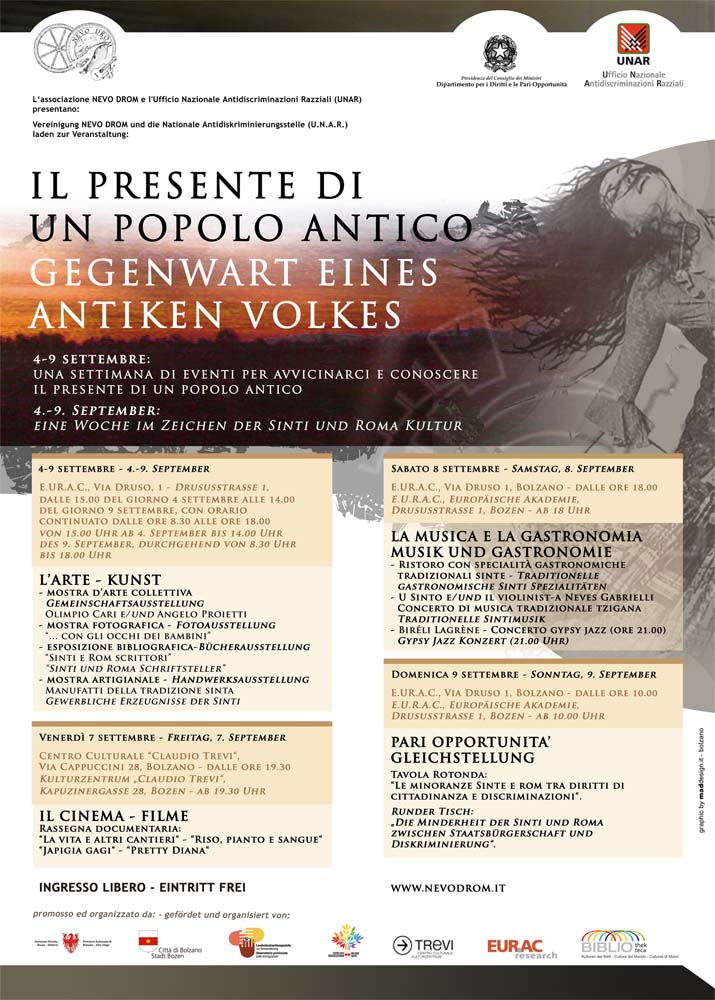 Dal 4 al 9 settembre Le esposizioni saranno visitabili dalle 15.00 del giorno 4 settembre alle 14.00 del giorno 9 settembre, con orario continuato dalle ore 8.30 alle ore 18.00 – foyer dell’Accademia Europea E.U.R.A.C. Via Druso, 1 Bolzano – mostra d’arte collettiva Olimpio Cari e Angelo Proietti – mostra fotografica “… con gli occhi dei bambini” – esposizione bibliografica “Sinti e Rom scrittori” – mostra artigianale Manufatti della tradizione sinta