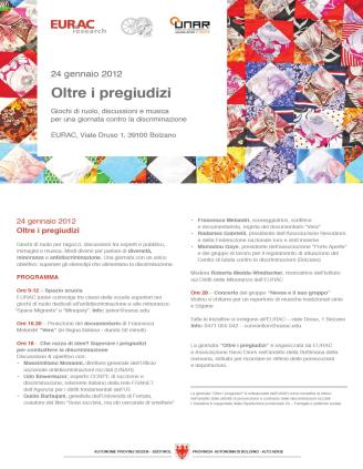 Accademia Europea di Bolzano, EURAC Oltre i pregiudizi Giochi di ruolo, discussioni e musica per una giornata contro la discriminazione L’Associazione Culturale di promozione Sociale (NEVO DROM), Accademia Europea di Bolzano (EURAC) Istituto di tutela delle minoranze, l’Ufficio Nazionale Antidiscriminazione Razziale ed Etnica (UNAR), PROVINCIA AUTONOMA DI BOLZANO propongono una iniziativa di rilievo nell’ambito delle attività di prevenzione e contrasto delle discriminazioni razziali con un evento Socio Culturale e di intrattenimento sui temi della memoria, della discriminazione razziale e di tutela delle minoranze. Premessa La Città di Bolzano come sempre e stata ed ancora oggi e molto sensibile alle culture espresse da varie minoranze, appartenendo ad una provincia che tutela le minoranze etnico – linguistiche tedesca e ladina, presenti sul territorio. La tematica della discriminazione razziale ha una serie infinita di aspetti e problematiche che si rispecchiano e con cui ci confrontiamo in tutti gli ambiti, sul lavoro, in tutti gli ambiti sociali, le implicazioni culturali si riflettono sempre più anche in ambito familiare, per questo motivo è di importanza fondamentale per tutta la comunità una azione di informazione e diffusione della tematica. Pensiamo a come siano diffuse nelle aziende ormai dove il personale è multiculturale e dove al conflitto che si crea naturalmente sul posto di lavoro si debba anche aggiungere la tensione razziale. Anche in ambito Europeo, Nazionale e provinciale esistono politiche antirazziste che faticano ad essere applicate. Anche nel nostro ambito provinciale di minoranze esistono anche minoranze che sono tutelate a livello provinciale ma abbiano ancora grandi difficoltà a livello magari a livello nazionale, come la comunità dei Rom e dei Sinti Quando si parla di minoranze Sinte e Rom, sui media o in incontri “di settore”, si evidenziano spessissimo negli ultimi anni gli aspetti sociali legati alla presenza Sinta e Rom sul territorio e quasi sempre si sottolineano esclusivamente i problemi anche con toni amplificati rispetto alla realtà dei fatti. Raramente vengono evidenziati gli aspetti positivi delle peculiarità culturali, tradizionali Sinte e Rom, tralasciando pregiudizi, paure e pensieri negativi legati a stereotipi che ci accompagnano da sempre. In questo ambito le generazioni che sempre più dovranno affrontare queste tematiche sono le giovani generazioni ed loro sono i primi che in queste tematiche devono essere coinvolti. Come al lavoro così nelle scuole oggi le classi multiculturali sono la norma. Queste sono le motivazioni che inducono nella settimana precedente al giorno della memoria per avvalorare la tematica è volontà della associazione NEVO DROM assieme all’istituto per la tutela delle minoranze di EURAC organizzare un evento socio culturale , con l’obiettivo di creare momenti di incontro tra persone appartenenti a diverse culture, a soddisfare l’interesse di coloro che vogliono conoscere meglio la diversità delle culture Sinte e Rom ed altre minoranze, la identità, le storie e memorie, la quotidianità per portare un messaggio di uguaglianza dei diritti e il godimento della parità tra gli individui che vivono in Europa e nel mondo. Attività didattiche Per combattere la discriminazione, il razzismo, la xenofobia e per affrontare con consapevolezza le difficoltà e i vantaggi della diversità, il lavoro di sensibilizzazione in ambito giovanile è di fondamentale importanza. Per questo motivo, l’Istituto sui Diritti delle Minoranze dell’EURAC propone nell´ambito della giornata contro il razzismo il gioco Minopoly e il gioco di ruolo Space Migrants 2513 che saranno offerti alle scuole e alle organizzazioni giovanili presenti in Alto Adige/Südtirol. Space Migrants: “Space Migrants 2513” è un gioco di ruolo che permette ai giovani di entrare in contatto con i temi dell’antidiscriminazione, della diversità, del conflitto e del pregiudizio in modo ludico e interattivo. Il gioco promuove un approccio creativo e solidale, e favorisce le competenze sociali, personali e strategiche dei partecipanti. MINopoly: Cos’é una minoranza? Perché deve essere tutelata? In che modo? Questi interrogativi verranno discussi dagli esperti dell’Istituto sui Diritti delle Minoranze assieme agli studenti. Successivamente gli studenti stessi si caleranno nel ruolo di esperti e viaggeranno per il mondo osservando le caratteristiche dei diversi gruppi e i conflitti etnici in atto per poi tenere una relazione alle Nazioni Unite. Proiezione del documentario “VERA” alla presenza della regista Francesca Melandri Nata a Roma 1964, dove è tornata a vivere dopo vari soggiorni in Asia, Nuova Zelanda e negli Usa e ben quindici anni di residenza in Alto Adige. Francesca Melandri è una sceneggiatrice, scrittrice e documentarista italiana. La scrittrice, ha iniziato giovanissima una lunga carriera di sceneggiatrice, firmando le sceneggiature, tra l’altro, di Zoo di Cristina Comencini (1988), Chiara e gli altri 1 e 2 (1989/90), Fantaghirò di Lamberto Bava(1991), Cristallo di Rocca di Maurizio Zaccaro (1998), Nati ieri di Genovese e Miniero (2006), molti episodi della serie Don Matteo (2001/2009). Ha esordito nella narrativa nel 2010 con ‘Eva dorme’ (Mondadori), un romanzo che ripercorre gli anni del terrorismo sudtirolese. Il romanzo è stato tradotto in tedesco[1], olandese (‘Eva slaapt’ – Cossee 2011). L’edizione francese (‘Eva dort’) è prevista per Gallimard nel 2012. Ha diretto i documentari Nel paese delle case di Lana (1993) e Vera (2010) Tavola Rotonda Razzismo e pregiudizi razziali: presupposti genetici, ambientali, sociali e culturali Se gli si consentisse di avere contatti con stranieri, scoprirebbe che sono persone come lui e che la maggior parte di quanto gli è stato detto di loro è pura menzogna. Il mondo chiuso e separato nel quale vive andrebbe in pezzi e potrebbero svanire la paura, l´od
